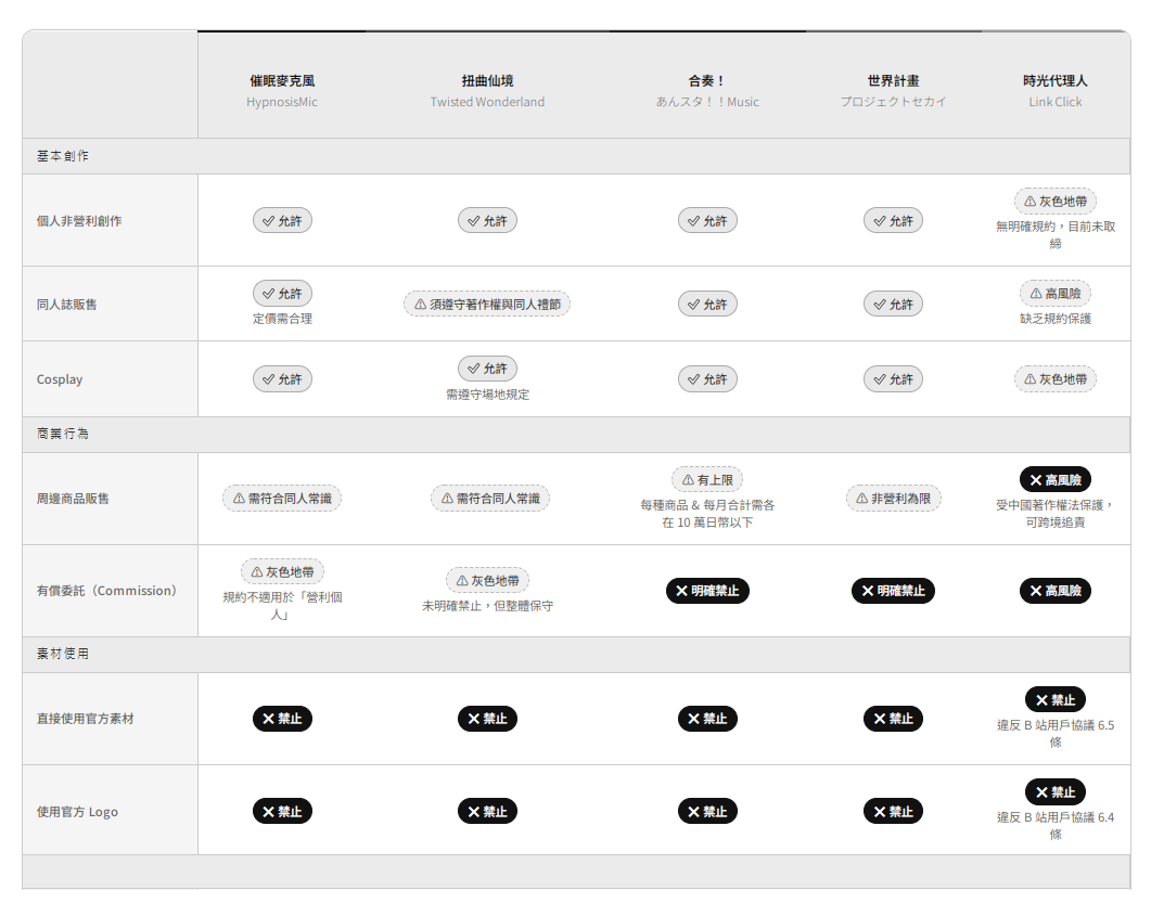 各作品規約隨時可能更新,創作前請務必確認最新官方頁面。